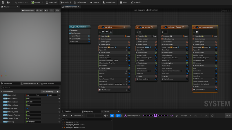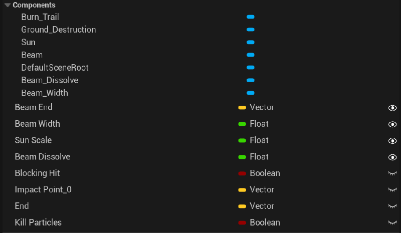 The start and end of the beam were driven by a line trace that searches for the closest geometry. At the collision point of the line trace the ground destruction effect was spawned.