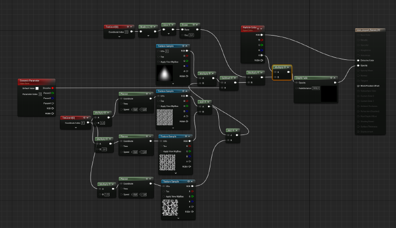 Each emitter had slightly different values like color, emissive intensity and texture stretching amount to create a more detailed and interesting final output.