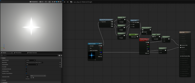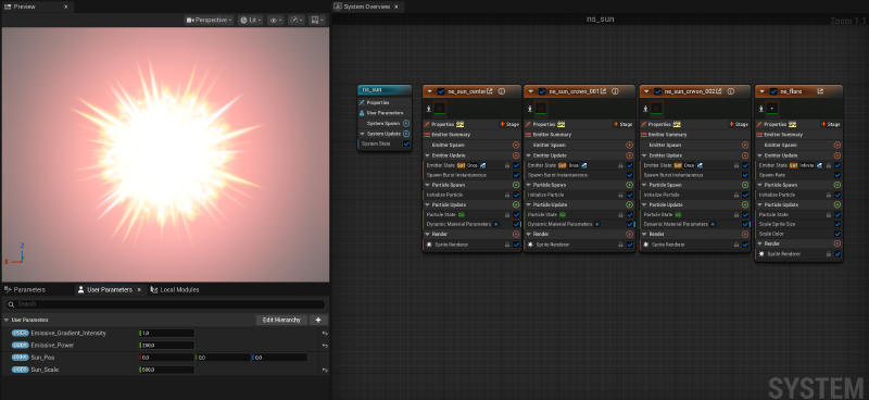 For the beam I used three ribbon emitters in Niagara with the same material and a fourth with a flare effect.