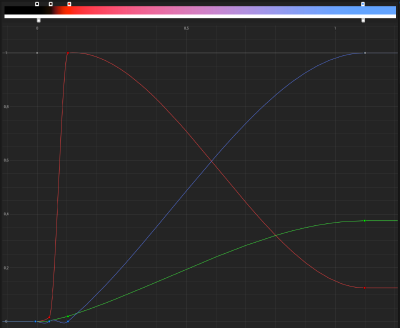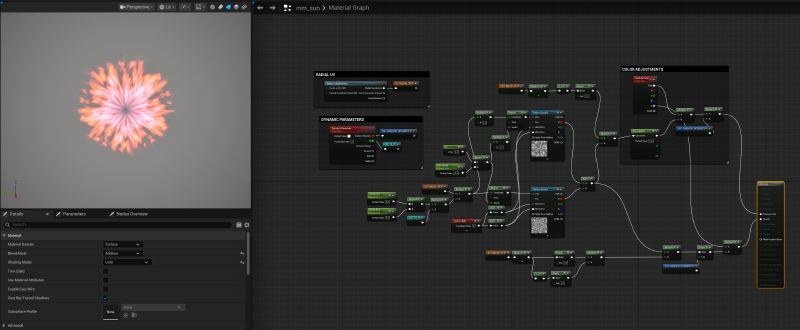 For the sun effect I used a simple tiling noise texture with Radial UVs to create a fire-rays effect. Also, using a color curve I created the purple to red colorization that gave the illusion of extremely hot temperatures on its core.