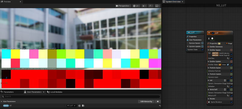 The random color texture (32x2 pixels), which functions similarly to a Look Up Table (LUT) was generated procedurally in Niagara using the Grid2D interface.