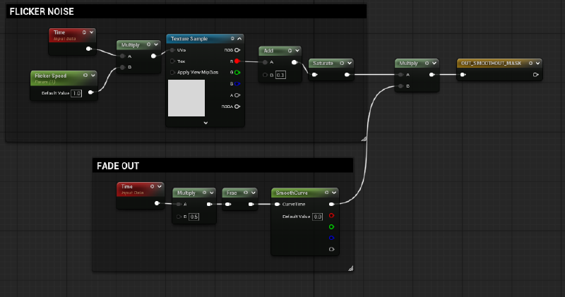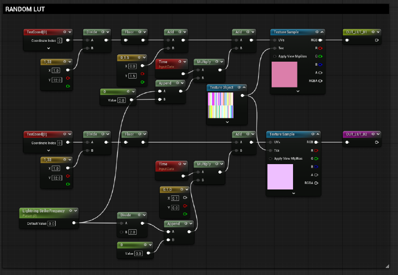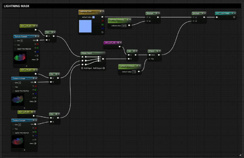 For additional detail, a subtle flickering noise was introduced. This uses a Time node randomized via a noise texture and shaped with a smooth curve to simulate the light fading in and out between lightning strikes.