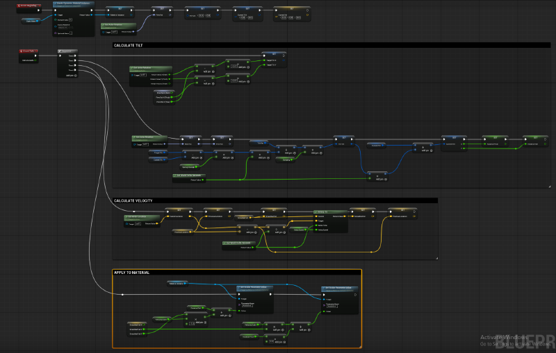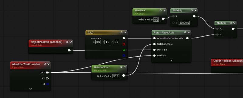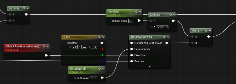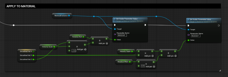 And wrap everything up by overwriting the WobbleX and WobbleY values of the material we created, based on the new Rotation and Velocity scales.