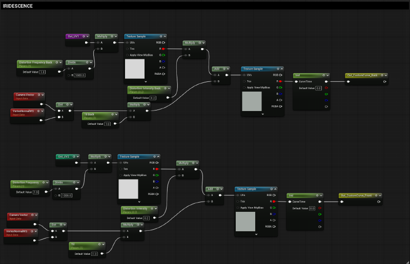 The shader above is nothing if we don’t apply it into a Blueprint logic that calculates the pendulum motion of the effect based on the rotation and velocity of the card in runtime.