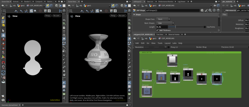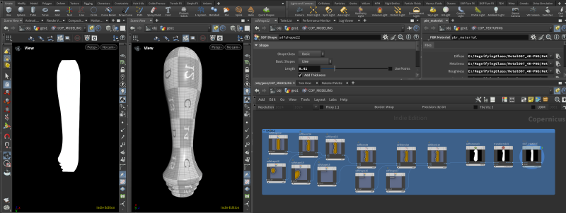 Copernicus gives a list of nodes for SDF shape creation and manipulation. Those SDFs can easily become geometry using the Trace node. Then, I cut the traced line in half and used a Revolve node to create the round shape for each part of the handle separately.