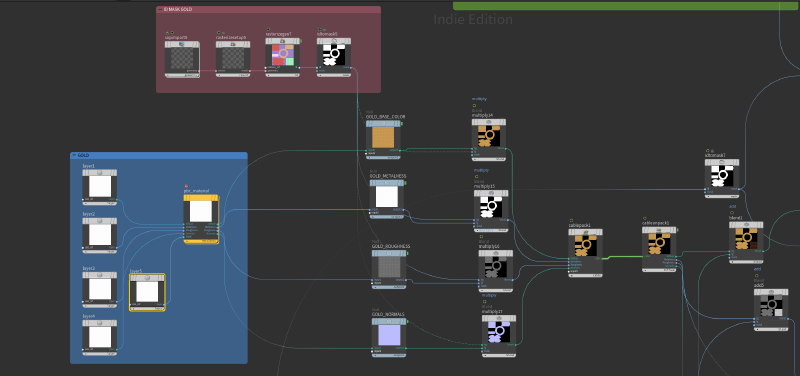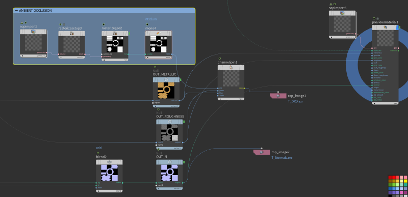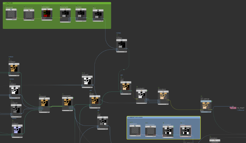 I took inspiration from some tutorials on texturing inside Copernicus from Entagma and decided to use a similar approach. Each part of the model had a different Name attribute, which, by using the Enumerate node, I managed to create different masks for each UV island separately. It’s important to mention two very helpful nodes for Ambient Occlusion and Curvature that I’m always using when I’m creating procedural assets.